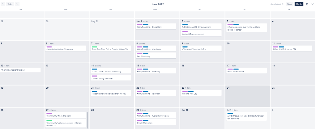 Calendar ideas varied from informative posts on breast cancer awareness to a weekly campaign post using the #WhyTeamGina hashtag on featured volunteers, board of directors and breast cancer survivors under the nonprofit.